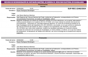 Este Recurso de Reconsideración, referido a los comicios de Guadalajara, que está en la fase de instrucción, deberá ser resuelto por el magistrado de la Sala Superior, Reyes Rodríguez Mondragón, a más tardar el lunes 30 de septiembre del 2024, pues el nuevo titular de la presidencia municipal de Guadalajara debe asumir su cargo en el primer minuto del martes primero de octubre del 2024. Hasta hoy la presunta ganadora es la emecista Verónica Delgadillo García, a quien impugna el morenista José María Martínez Martínez, quien pide la nulidad de los comicios y que se convoque a unas elecciones extraordinarias.