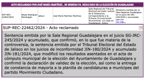 También está en la Sala Superior del Tribunal Electoral del Poder Judicial de la federación el Recurso de Reconsideración interpuesto por el candidato de Morena a la Presidencia Municipal de Guadalajara, José María Martínez Martínez, en contra de la Sentencia emitida por la Sala Guadalajara del Tribunal Electoral del Poder Judicial de la Federación en la cual confirmó la resolución del Tribunal Electoral del Estado de Jalisco que modificó los resultados del cómputo de la elección de munícipes de Guadalajara y ratificó, en lo que fue materia de impugnación, la declaración de validez de la elección, así como la entrega de la constancia de mayoría a la candidata de Movimiento Ciudadano, Verónica Delgadillo García.