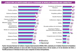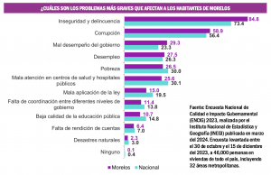 La Encuesta Nacional de Calidad e Impacto Gubernamental (ENCIG) 2023, realizada por el Instituto Nacional de Estadística y Geografía (INEGI) publicada en marzo del 2024, establece que el 84.8 por ciento de los morelenses considera que la inseguridad es la más grave calamidad que afecta a su estado; en segundo lugar, el 58.9 por ciento se queja de la impunidad y el 29.3 por ciento considera que el tercer mal que afecta a su entidad es el desempeño del mal gobierno.