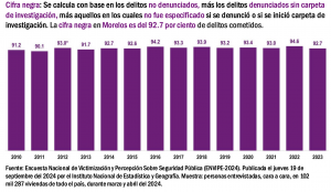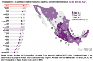 Por su parte, la Encuesta Nacional de Victimización y Percepción Sobre Seguridad Pública (ENVIPE-2024), publicada por el INEGI el pasado 19 de septiembre del 2024, indica que Morelos aparece en el primer lugar nacional, con respecto a la percepción de inseguridad que declara su población, que llega al 90.1 por ciento.