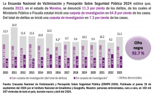 La misma Encuesta Nacional Sobre Seguridad Pública 2024 estima que, durante 2023, en el estado de Morelos, se denunció 11.3 por ciento de los delitos, de los cuales el Ministerio Público o Fiscalía estatal inició una carpeta de investigación en 64.8 por ciento de los casos. Del total de delitos se inició una carpeta de investigación en 7.3 por ciento de los casos.