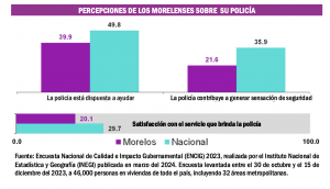 En Morelos apenas el 20.1 por ciento se manifiesta satisfecho con el servicio que brinda la policía preventiva. Y únicamente el 39.9 por ciento percibe en los policías disposicipon para atender y ayudar a la población.