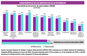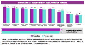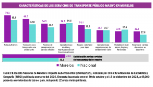 Hay otros servicios en los cuales el gobierno de Morelos no resulta tan mal calificado. Por ejemplo, el 54.9 por ciento se expresa satisfecho con los servicios de saludo estatales. La evaluación con respecto a la educación pública básica es particularmente alta: 72 por ciento se dicen contentos. Mientras que los servicios públicos de transporte masivo son objeto de un serio reproche pues sólo 43 por ciento los aprueba.