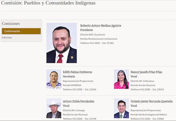 Mientras que en el portal del legislativo, aparece ya Medina a la cabeza de esa comisión, con Edith Palma, la mujer rarámuri, en el cargo de Secretaria; y como vocales a los panístas Nancy Frías y Arturo Zubía, representantes de Chihuahua y Camargo respectivamente, y a Octavio Javier Borunda Quevedo (PVEM).