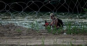 Migrantes caminan entre alambre de púas mientras tratan de cruzar el Río Bravo en la frontera de EU y México . Foto: Eric Gay, AP