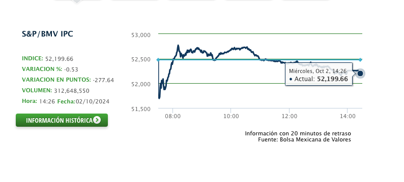 En México, el S&P/BMV IPC, índice de la Bolsa Mexicana de Valores (BMV) que mide a las acciones locales más negociadas, finalizó la sesión con una pérdida de 0.53 por ciento, ubicándose en 52 mil 199.66 puntos.