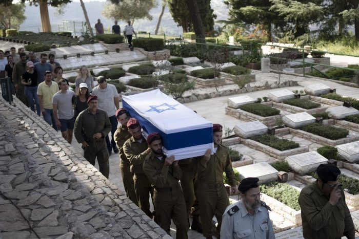 Soldados portan el féretro del capitán del ejército israelí Eitan Yitzhak Oster, muerto en combate en Líbano, durante su funeral en el cementerio militar de Monte Herzl. Foto: Maya Alleruzzo, AP.