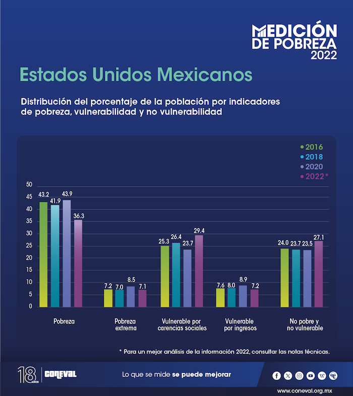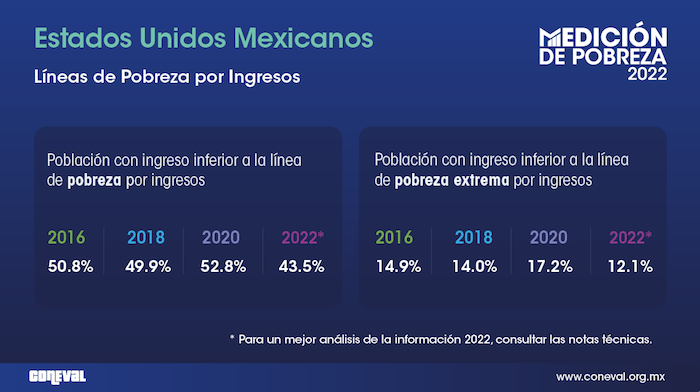 “La tasa oficial de pobreza multidimensional, que combina la pobreza monetaria con indicadores de privación social, cayó del 43.9 por ciento en 2020 al 36.3 por ciento en 2022, sacando a 8.9 millones de mexicanos de la pobreza, y 46.8 millones siguen viviendo en la pobreza. La disminución se debe principalmente a la caída de la pobreza monetaria, que cayó del 52.8 al 43.5 por ciento”, señaló el informe sobre estimaciones de pobreza multidimensional 2022.