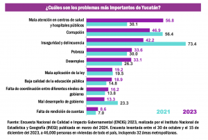 Además de los tres problemas más importantes, a los yucatecos también les inquietan el desempleo, la mala aplicación de la ley, la baja calidad de la educación pública, la falta de coordinación entre los diferentes niveles de gobierno, el mal desempeño del gobierno y la falta de rendición de cuentas.