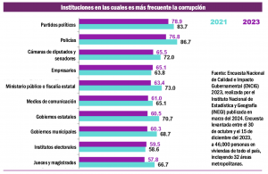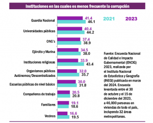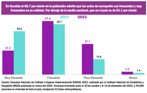 Por otra parte, en Yucatán el 68.7 por ciento de la población admite que los actos de corrupción son frecuentes y muy frecuentes en su entidad. Por debajo de la media nacional, que en el país es de 83.1 por ciento. Los yucatecos identifican a los partidos políticos como las instituciones más corruptas, segudos de los policías, así como diputados y senadores. En contraste, la gente considera menos propensas a la corrupción los vecinos y los familiares.