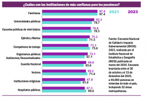 Por lo tanto, no es extraño que sea la familia la institución que más confianza inspira a los yucatecos, seguida de las universidades públicas y las escuelas públicas de educación básica. En el otro extreño, las instituciones que más desconfianza despiertan en Yucatán son los diputados y senadores, los sindicatos y los partidos políticos.