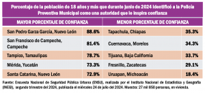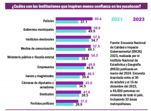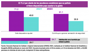 La policía municipal de Mérida, la capital de Yucatán, es la cuarta que más confianza despierta en el ámbito nacional, sólo superada por las corporaciones de San Pedro Gaza García, Nuevo León; Campeche, Campeche y Tampico, Tamaulipas. El 71.2 por ciento de los yucatecos consideran que su policía sí tiene disposición para ayudar a la gente.