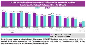 Los servicios de salud están muy cerca de recibir una calificación aprobatoria, pues el 58.6 por ciento expresa satisfacción por los servicios estatales de salud y del ahora desaparecido Instituto de Salud para el Bienestar (INSABI).
