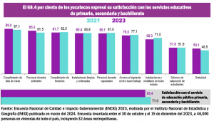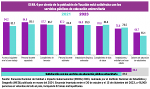 También es aceptable en Yucatán la aprobación de los ciudadanos con respecto a los servicios educativos básicos, en primaria, secundaria y bachillerato, pues el 68.4 por ciento se expresa satisfecho. En tanto que el 88.4 por ciento de la población de Yucatán está satisfecha con los servicios públicos de educación universitaria.