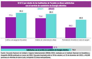 Donde se requiere un reforzamiento del servicio en Yucatán es en el suministro de energía eléctrica. El 57.5 por ciento de los yucatecos se dicen satisfechos con el servicio de suministro de Energía eléctrica y el 77.3 afirma que ha recibido ese servicio sin apagones frecuentes.