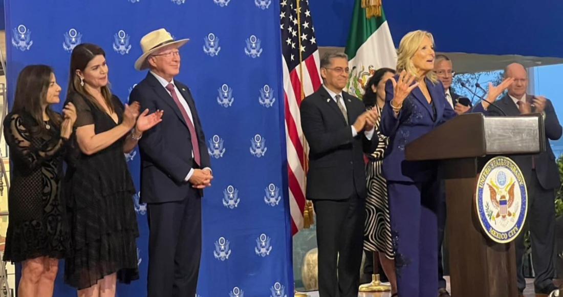 Durante la recepción organizada por el Embajador Ken Salazar, la esposa del Presidente Joe Biden destacó la frase de Sheinbaum, “no llego sola, llegamos todas” para resaltar el ambiente que se respiraba en México previo a la investidura de la morenista.