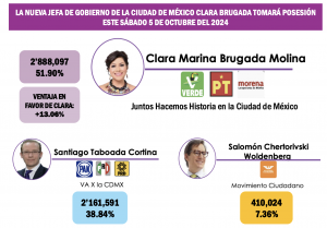 Ciudad de México, 4 de octubre (SinEmbargo).- Con el respaldo de los gobiernos de las diez alcaldías más pobladas de la Ciudad de México, que tendrán influencia administrativa y política directa en por lo menos el 71 por ciento de la población y el 71 por ciento de los potenciales votantes, este sábado 5 de octubre del 2024 tomará posesión como nueva Jefa de Gobierno de la capital de la República la morenista Clara Marina Brugada Molina, quien en los pasados comicios del domingo 2 de junio del 2024 derrotó al panista Santiago Taboada Cortina con una diferencia de 13.6 por ciento. Seis años antes, su antecesora Claudia Sheinbaum Pardo, ahora presidenta de la República, ganó el gobierno capitalino con una ventaja de 15.88 por ciento sobre la candidata de la coalición PAN-PRD-Movimiento Ciudadano, Alejandra Barrales Magdaleno.