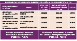 Una ventaja importante para la nueva administración morenista es que tendrá los gobiernos de las cuatro alcaldías más pobladas de la capital del país, dos de ellas que rebasan el millón de habitantes: Gustavo A. Madero, Iztapalapa, Álvaro Obregón y Tlalpan. Más del 71 por ciento de la población y más del 71 por ciento de los votantes potenciales en Ciudad de México estarán gobernados directamente por alcaldes de Morena.