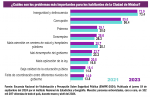 La nueva jefa de gobierno tendrá que atender, prioritariamente, los problemas que los habitantes de la Ciudad de México consideran más importantes, según la Encuesta Nacional de Victimización y Percepción Sobre Seguridad Pública (ENVIPE-2024), que los ubica en el siguiente orden: Inseguridad y delincuencia, corrupción, pobreza, desempleo y mala atención en centros de salud y hospitales.