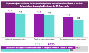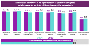 El panorama es menos complejo para el nuevo gobierno capitalino en el ámbito de la educación pública, pues el 72.2 por ciento de los habitantes de la capital del país se reconoce satisfecho con los servicios de educación pública en primaria, secundaria y bachillerato. Mientras que el 82.4 por ciento de la población se expresó satisfecho con los servicios públicos de educación universitaria. Igual la mayoría de los capitalinos aprueba el servicio del suministro de energía eléctrica.