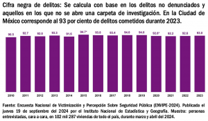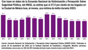Las estadísticas de la Encuesta Nacional de Victimización y Percepción Sobre Seguridad Pública (ENVIPE-2024), publicada el jueves 19 de septiembre del 2024 por el Instituto Nacional de Estadística y Geografía, muestran que en Ciudad de México sí ha habido una disminución en la tasa de delitos. Pero la tasa de impunidad sigue siendo muy alta.