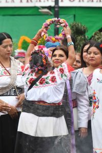 Una vez arribó al Zócalo, la nueva Jefa de Gobierno, fue recibida por representantes de los pueblos originarios de la CdMx, quienes procedieron a colocarle una serie de prendas y adornos tradicionales.