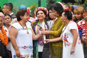 Acto seguido, le fue entregado a la mandataria capitalina el bastón de mando, a manos de un par de mujeres, una de las cuales afirmó estar convencida de que trabajará "para las comunidades indígenas residentes". "Somos una gran parte de esta población, somos el rostro digno, el rostro trabajador; somos triquis, somos mixtecos, somos mazatecos, somos mazahuas, somos otomís; somos muchos, muchas y esta ciudad nos pertenece, y con ella caminaremos", expresó
