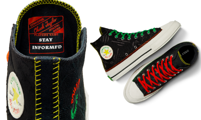 El Chuck 70 y el Chuck 70 De Luxe Squared presentan uppers negros con acentos vibrantes en rojo, amarillo y verde. La costura decorativa en el Chuck 70 incluye un logo escudo en toda su extensión y detalles coloridos, mientras que el Squared crea una estética única y clásica del futuro a través de ángulos audaces. Elementos adicionales de herencia incluyen cordones coloridos y parches personalizados en el tobillo del Chuck Taylor, placas de licencia y suelas, combinando perfectamente el ADN de Converse y Daily Paper.