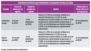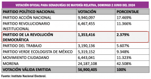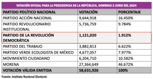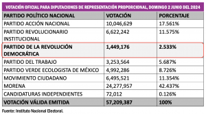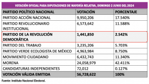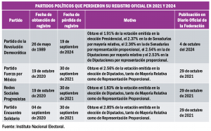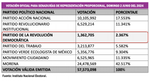 El caso más reciente de pérdida de registro, el del PRD, se derivó de que el partido del sol azteca apenas alcanzó el 1.91 por ciento de la votación emitida en la elección Presidencial del domingo 2 de junio del 2024; el 2.37 por ciento en los comicios para Senadurías de Mayoría Relativa y el 2.36 por ciento en la contienda para Senadurías de Representación Proporcional. El perredismo apenas alcanzó el 2.54 por ciento en los comicios de Diputaciones de Mayoría Relativa y el 2.53 por ciento en la contienda de Diputaciones por el principio de Representación Proporcional.
