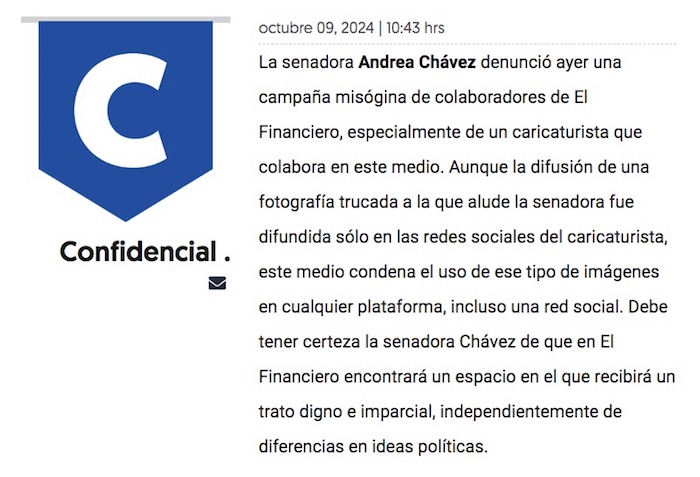 Pese a que el pasado 8 de octubre, día en que la Senadora denunció que distintos colaboradores del diario El Financiero la han atacado e incluso han fabricado con Inteligencia Artificial imágenes eróticas con su rostro, Chávez apuntó que no procedería legalmente contra Garci Nieto, posteriormente decidió hacerlo al amparo de la Ley Olimpia, la cual contempla sanciones de tres a seis años de prisión para quienes incurran en las agresiones previstas y multas que van de 500 a mil Unidades de Medida y Actualización (UMA), cuyo valor diario en este 2024 es de 108.57 pesos.