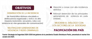 El pasado martes 8 de octubre del 2024, al presentar la estrategia de seguridad nacional de la nueva administración de la presidenta Claudia Sheinbaum Pardo, el Secretario de Seguridad Pública federal Omar Hamid García Harfuch, habló de los cuatro ejes principales en los cuales se basará su trabajo: 1.- Atención a las Causas; 2.- Consolidación de la Guardia Nacional; 3.- Fortalecimiento de inteligencia e investigación y 4.- Coordinación absoluta en el Gabinete de Seguridad y con las Entidades Federativas.