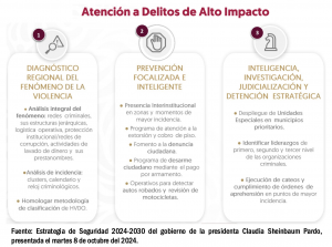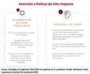 Entre las prioridades de la nueva administración está una acción más directa contra el crimen organizado para disminuir los homicidios dolosos, los delitos de alto impacto como secuestro, extorsión y robo con violencia. El propósito es neutralizar a los generadores de violencia y redes criminales, detenerlos y ponerlos tras las rejas, con atención a zonas con alta incidencia delictiva.