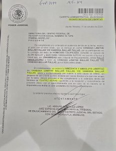 "Me permito informar a usted que por unanimidad este Tribunal de Enjuiciamiento emitió fallo absolutorio a favor de Vanessa Linette Ballar Fallas por su participación en la comisión del delito de homicidio calificado", ordenó el juzgador a la directora del Centro Federal de Readaptación Social Número 16 "CPS Femenil Morelos", se lee en el documento por parte del Juez Adolfo González.