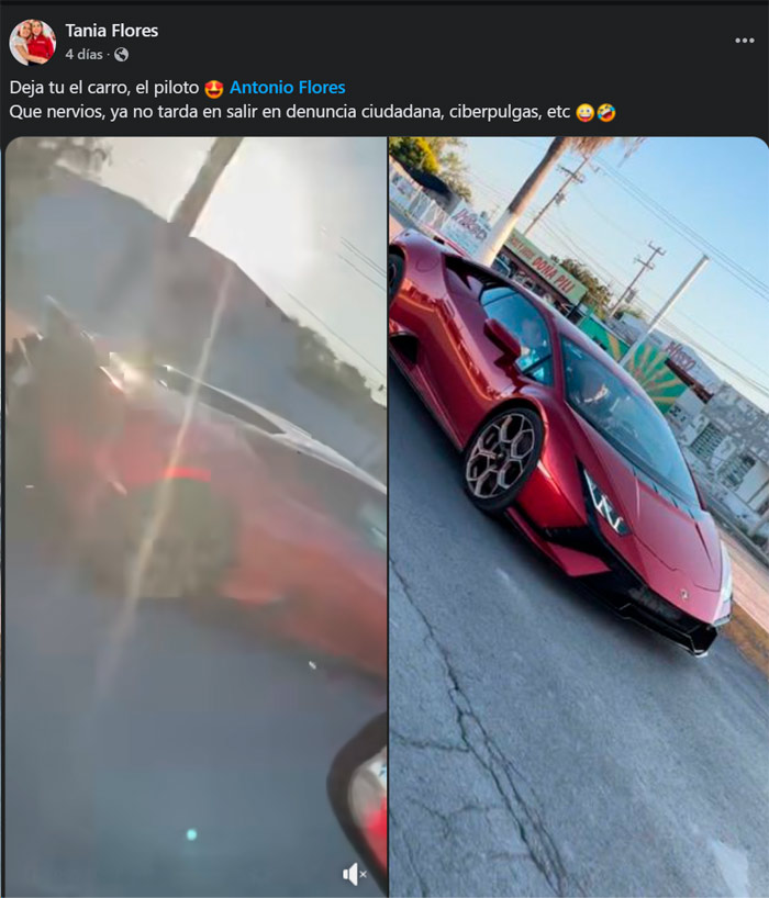 Tania Flores, exalcaldesa de Múzquiz, recientemente realizó comentarios desfavorables, cuando compartió en redes sociales el video de su hermano a bordo de su lujoso Lamborghini: “Deja tú el carro, el piloto Antonio Flores. Que nervios, ya no tarda en salir en denuncia ciudadana, ciberpulgas, etc. Ardidos 1, 2, 3 jaja”.