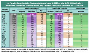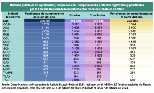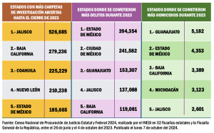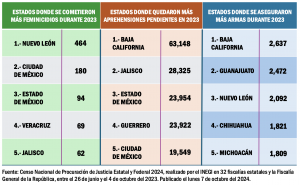Por ejemplo, Jalisco aparece en primer lugar como la entidad en la cual se abrieron más carpetas de investigación durante 2023 y es también el segundo estado donde más órdenes de aprehensión quedaron pendientes de ejecutarse. Baja California aparece en primer lugar como la entidad en donde quedaron más órdenes de aprehensión pendientes de cumplimentarse y Estado de México aparece en primer lugar como el estado donde más delitos se cometieron el año pasado.