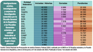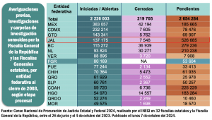 De acuerdo con los resultados que arroja el Censo Nacional de Procuración de Justicia Estatal y Federal 2024 del Inegi, el compendio de seis apartados diferentes, que miden la eficiencia de las fiscalías estatales en seis campos diferentes, estas tres entidades aparecen en cinco de esos espacios de observación entre las primeras cinco entidades del país más afectadas, y en por lo menos uno de ellos cada una de estas tres entidades aparece en primer lugar.