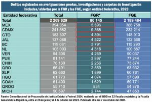 Ciudad de México, 17 de octubre (SinEmbargo).- Baja California, Estado de México y Jalisco son las tres entidades del país que experimentan más graves problemas de inseguridad y delincuencia, en las cuales se requiere tanto apoyo en el campo de la seguridad preventiva, como de la investigación y persecución de delitos, según los resultados que arroja el Censo Nacional de Procuración de Justicia Estatal y Federal 2024, realizado por el Instituto Nacional de Estadística y Geografía (INEGI) en las 32 fiscalías estatales y en la Fiscalía General de la República, entre el 26 de junio y el 4 de octubre del 2023. Este informe fue publicado el lunes 7 de octubre del 2024.