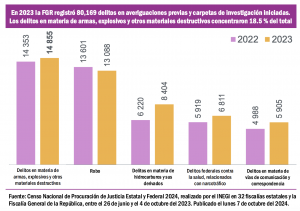 ¿Sabe usted cuales son los delitos del fuero federal que tuvieron mayor incidencia durante el 2023? Pues según el Censo sobre las procuradurías, los delitos del orden federal más comunes fueron: Delitos en materia de armas, explosivos y otros materiales destructivos; robos, en particular el de hidrocarburos, y en cuarto lugar los muy mencionados delitos federales contra la salud, relacionados con narcotráfico.