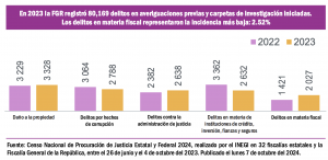 El Censo sobre el desempeño de las fiscalías estatales nos permite observar que la entidad en donde más delitos federales se investigaron durante 2023 fueron Ciudad de México, Estado de México, Jalisco, Guanajuato y Nuevo León.