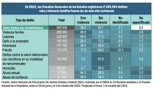 Por otra parte, el delito más generalizado del fuero común, que está en el ámbito de las fiscalías estatales, fue el robo en sus diversas modalidades. En segundo delito del fuero común más frecuente en los estados es la violencia familiar y en tercero, las lesiones. Estos dos últimos suelen ir vinculados. Lo curioso es que con respecto a los delitos de los cuales son víctimas las mujeres, la mayoría de las fiscalías del país no muestran un especial interés por atenderlos.
