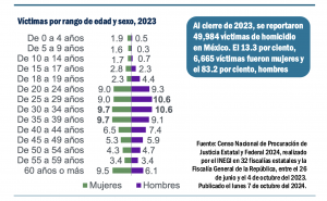 ¿Cuáles personas y de qué rangos de edad sufrieron los mayores embates de la violencia durante 2023? Bueno, entre los varones quienes experimentaron más agresiones fueron las personas de los rangos de edad de 25 a 29 años y de 30 a 34 años, en tanto que, entre las mujeres, los más altos índices de agresiones se dieron entre mujeres de 30 a 34 años y de 35 a 39 años de edad.