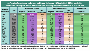 Desde hace buen tiempo que Guanajuato experimenta graves problemas de inseguridad. Por eso no es extraño que, en el capítulo referido a los homicidios, esa importante entidad de El Bajío aparezca en primer lugar en el país, seguido por Estado de México, Baja California, Michoacán y Jalisco. Un caso singular, según los datos de este Censo sobre las fiscalías, elaborado por el INEGI, es que el estado de Nuevo León aparece con un registro de 464 feminicidios durante el 2023, seguido por Ciudad de México con 180.