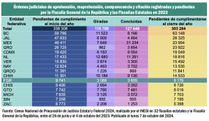 Un dato que dimensiona en gran medida la eficiencia de las fiscalías es el que se refiere a la ejecución de órdenes de aprehensión, y la entidad que registra el más grande atraso en ese rubro durante 2023 es Baja California, con 63 mi 148 arresto sin ejecutar, mientras que en segundo lugar está Jalisco, con 28 mil 325 aprehensiones pendientes al cierre del año pasado.
