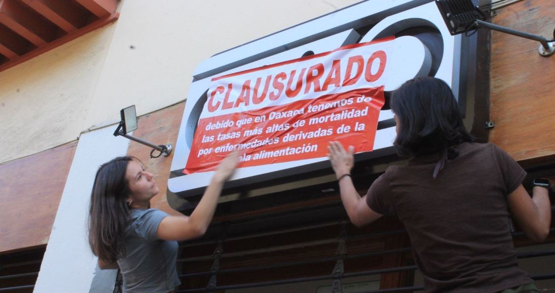Un tercer sello de clausura señala la interferencia de estas corporaciones en la política pública: "CLAUSURADO por incidir en políticas públicas que ponen en riesgo a la población de Oaxaca y México". Oaxaca ha sido víctima, al igual que el país, de la interferencia de FEMSA, propietaria de OXXO, y de FEMSA-Coca-Cola, en contra de políticas públicas dirigidas a proteger la salud y el medio ambiente. Cuando el Congreso de Oaxaca prohibió los plásticos de un solo uso, una política recomendada por el Programa de Naciones Unidas para el Medio Ambiente, fueron las acciones jurídicas de FEMSA-Coca-Cola las que detuvieron la medida en la Suprema Corte de Justicia de la Nación. Han hecho lo mismo contra muchas otras políticas, tanto a nivel nacional como local, como la prohibición de exhibir las cajetillas de cigarros en los puntos de venta, una medida recomendada por la Organización Mundial de la Salud. Gracias a sus acciones jurídicas, FEMSA ha mantenido la exhibición de tabaco en sus más de 23 mil establecimientos en todo el país, en el lugar más visible, detrás de las cajas de cobro, con la pared completamente tapizada de cajetillas de cigarrillos. Hay que recordar la letalidad de este producto: la mitad de los fumadores mueren por una enfermedad relacionada con este vicio.