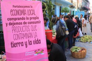 El OXXO está clausurado; es el Día Mundial de la Alimentación. Enfrente, en contraste radical con lo que se encuentra dentro del OXXO, sobre una mesa, se ofrecen ricas tlayudas y tostadas de San Antonio de la Cal, la deliciosa bebida de tejate de San Andrés Huayapam, jugosas manzanas de la Sierra Sur, matas de maíz y elotes de San Juan Bautista La Raya, tamales de San Pablo Etla, harina, alegrías y galletas de amaranto de Santa Cruz Etla, frijoles de la Sierra Mixe, trigo de la Sierra Juárez, hierbas medicinales de los Valles Centrales y calabazas de San Jacinto Amilpas. Todo sobre la mesa, ahí en la calle, frente al Palacio de Gobierno y frente a un OXXO clausurado por el movimiento #OaxacaSinChatarra, conformado por más de 25 organizaciones.