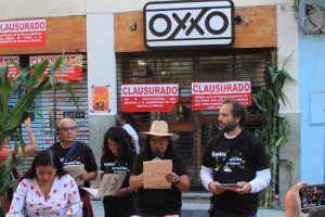 Otro sello de clausura en la fachada del OXXO dice: "CLAUSURADO por expender productos que dañan la salud". Ahí, tras la reja del OXXO clausurado, se encuentran más de 600 productos ultraprocesados, empaquetados en plástico, embotellados en plástico o vidrio, enlatados en aluminio, cada uno con una larga lista de ingredientes artificiales. Productos que dañan la salud y contaminan el ambiente. Elaborados para ser hiperpalatables, estos productos están respaldados por inversiones multimillonarias en publicidad, todo con el fin de generar adicción y desplazar los alimentos naturales y la hidratación con agua. Son productos con exceso de azúcares, edulcorantes, sodio, grasas saturadas, colorantes, saborizantes artificiales y otros aditivos. No pueden llamarse alimentos porque simplemente no alimentan. Y no solo eso, además de la comida chatarra y las bebidas endulzadas embotelladas, OXXO es la cadena más grande del país en la venta de cigarrillos, responsables de la muerte de 60 mil personas cada año en México. También es la principal cadena de venta de bebidas alcohólicas, productos responsables de alrededor de 40 mil muertes anuales en el país. Recientemente, han incorporado la venta de vapeadores y bolsitas de nicotina, es decir, todo lo que pueda ser adictivo y rentable. El consumo de alcohol está asociado al aumento de la violencia de género, intrafamiliar y comunitaria. Cuantos más OXXOs, es decir, más puntos de venta, más consumo y más violencia. Y, por supuesto, también venden Coca-Cola y todas sus marcas. Se estima que 40 mil muertes anuales en México están asociadas al consumo de bebidas azucaradas, responsables de un porcentaje significativo de las muertes por diabetes y enfermedades cardiovasculares. Enfrente, sobre la mesa, están los alimentos que estos productos y esta mercadotecnia están desplazando: es la resistencia cultural, de salud y comunitaria.