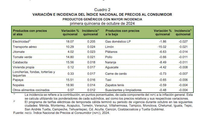 Entre los productos que tuvieron mayor alza en los precios e la primeras quincena de octubre están: nopales (18.90 por ciento), electricidad (18.07 por ciento), calabacita (15.56 por ciento), papaya (15.51 por ciento) y tomate verde (14.80 por ciento).