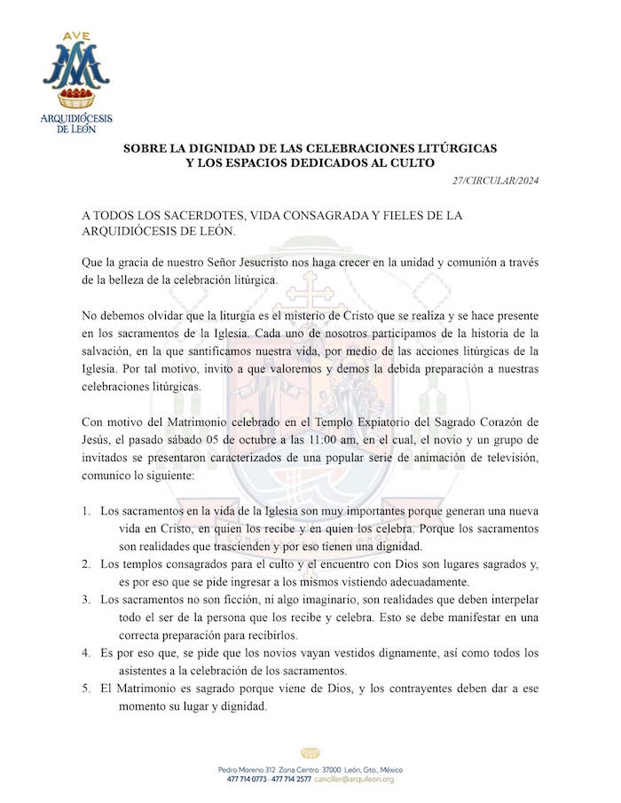 La boda temática no tardó en dar de qué hablar y la Arquidiócesis de León, liderada por el Arzobispo Jaime Calderón Calderón, emitió un comunicado en el que anunció la prohibición de cualquier tipo de celebración temática en cualquiera de los templos de León, Guanajuato.