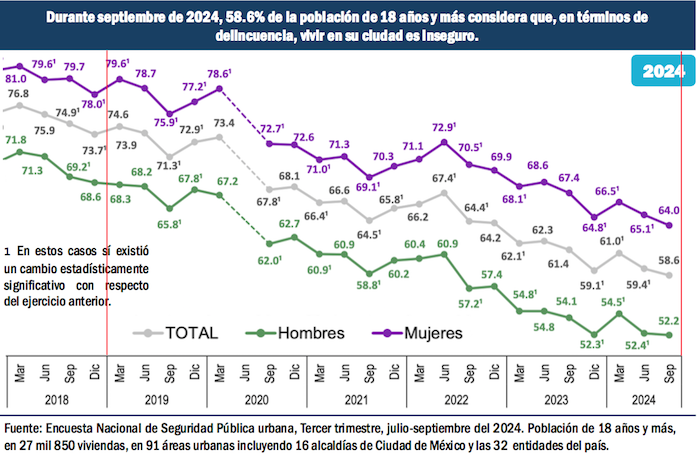 En el periodo referido 2018-2024, entre las mujeres la sensación de inseguridad de vivir en sus ciudades disminuyó del 78.0 por ciento al 64 por ciento, un 14 por ciento menos; y entre los varones, la sensación de inseguridad bajó del 68.6 por ciento al 52.2 por ciento, un 16.4 por ciento de caída en la percepción del miedo de quienes viven en las 91 principales ciudades del país, en las 32 entidades de la República.