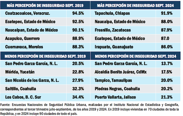 Los escenarios de las más altas percepciones de inseguridad se movieron de Coatzacoalcos, Veracruz, que en 2019 estaba en primer lugar, hasta Tapachula, Chiapas, que en la medición de septiembre del 2024 se ubica como la más agobiada por la violencia.